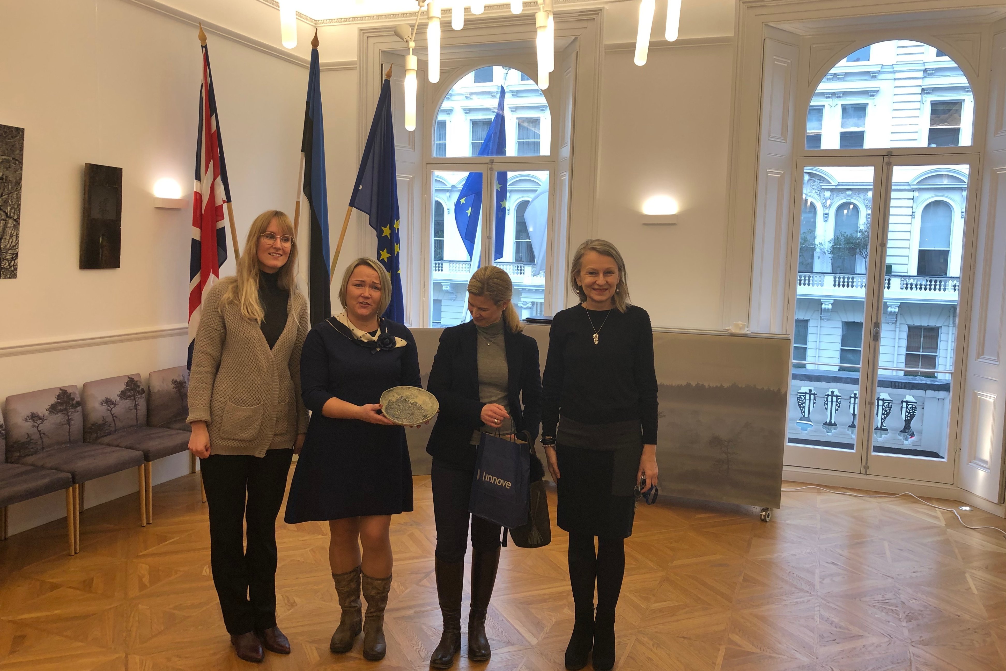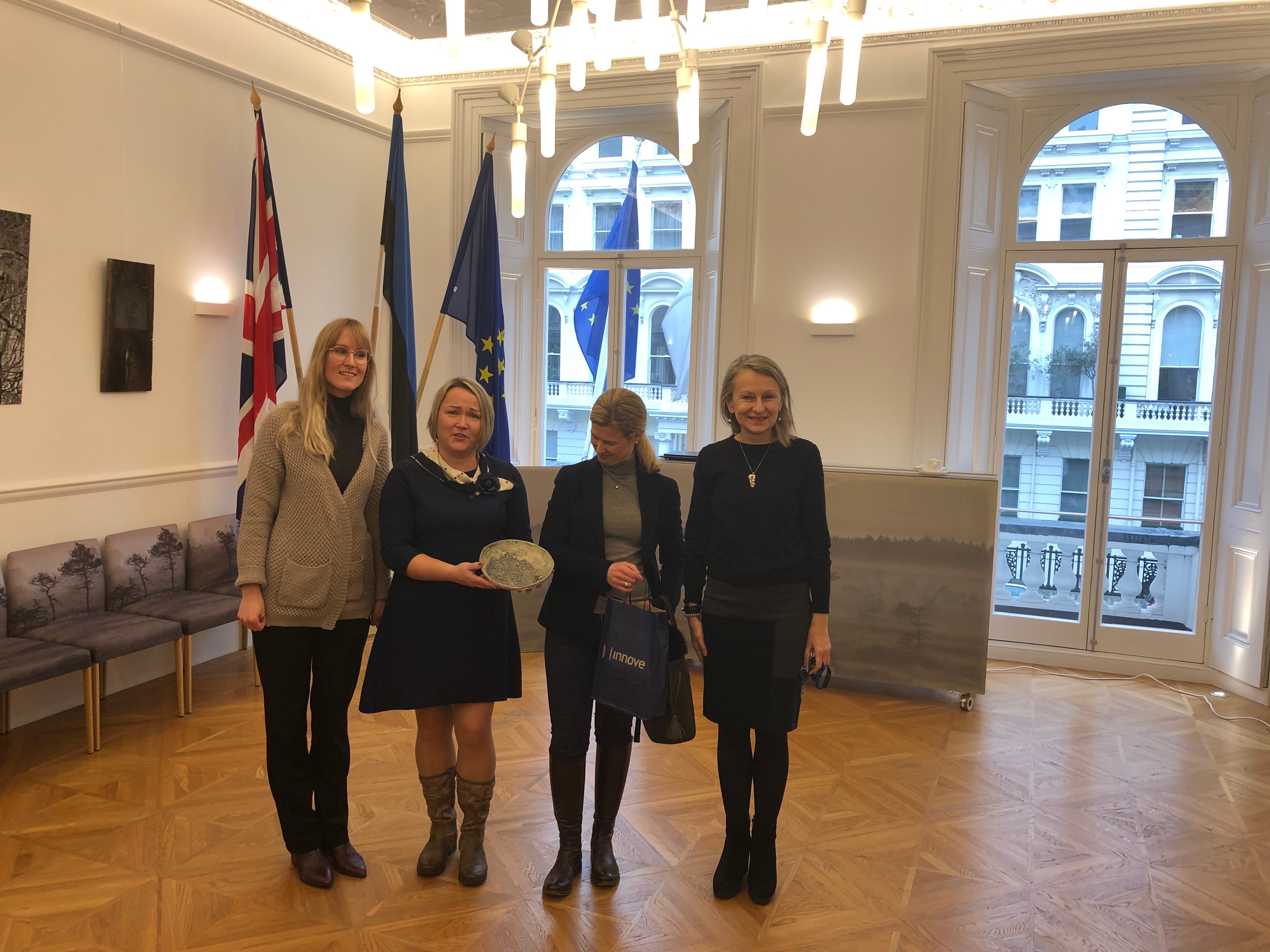 Eesti Suursaatkond Londonis ja suursaadik Tiina Intelmann´i (fotol paremalt esimene) vastuvõtt kujunes siiraks ja ainulaadseks, ühtlasi sain seal üle anda kingitusena meie Urvaste koolis õpetaja Elina Antsi käe all valminud keraamika.