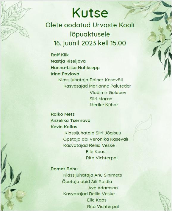 Olete oodatud Urvaste Kooli lõpuaktusele 16. juunil 2023 kell 15.00