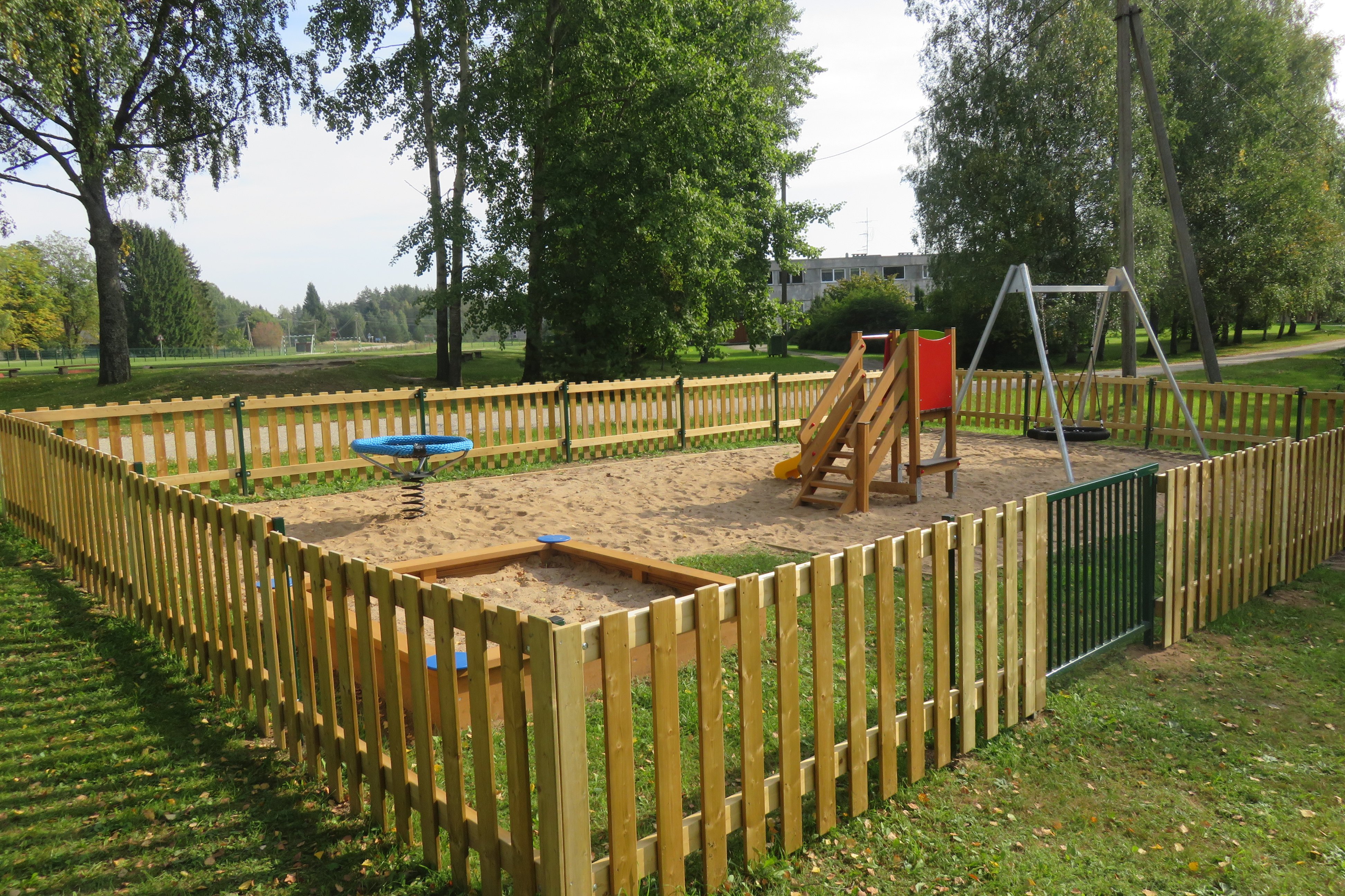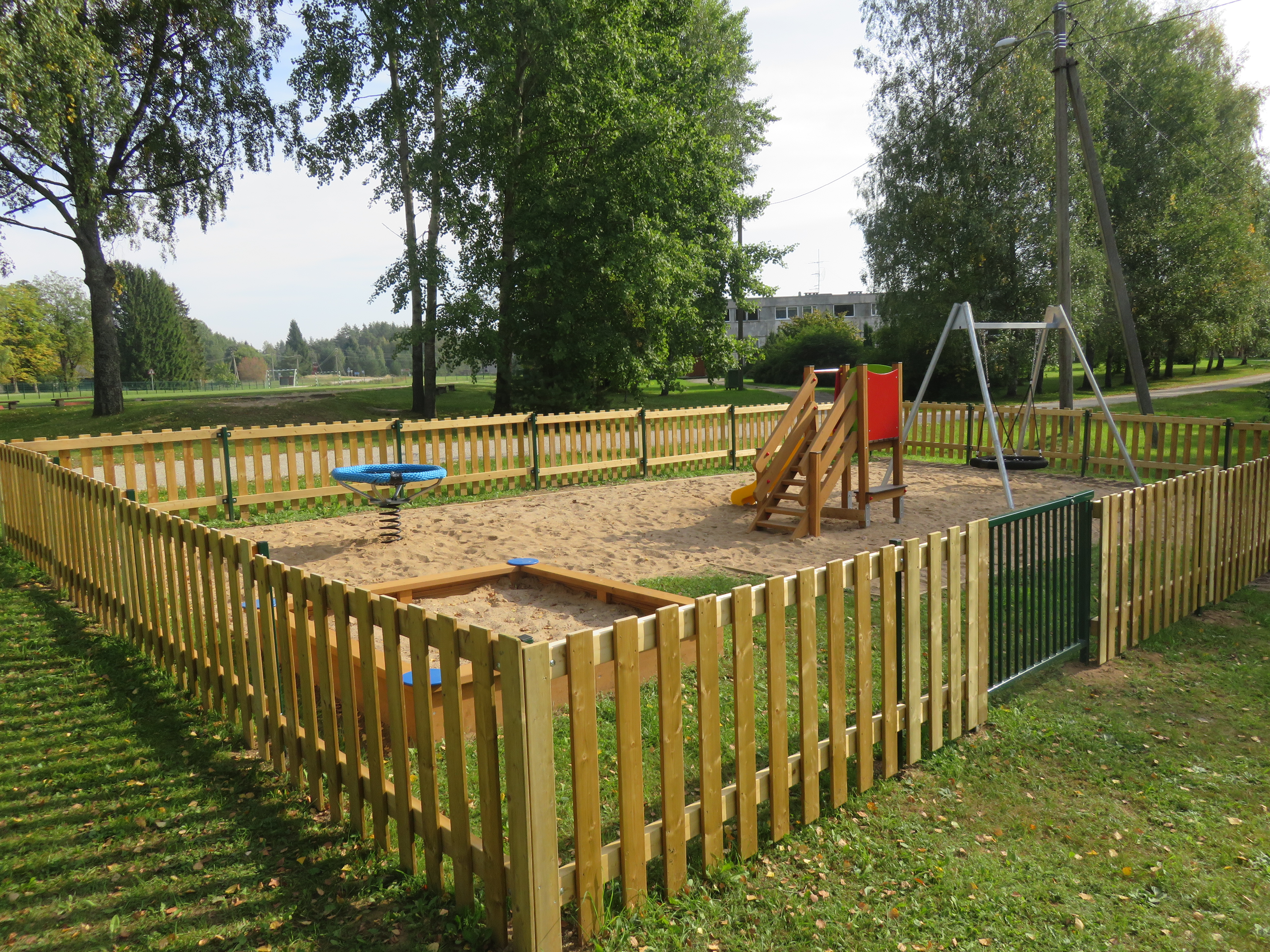 2018. aasta juulis alustasime mänguväljaku planeerimisega. Täna avasime kena puitaiaga piiratud mänguväljaku. Mänguväljakule on paigaldatud võrkpesakiik, vedrupesakiik, liumägi Mürakaru, liivakast ja rajatud liivast turvaala.